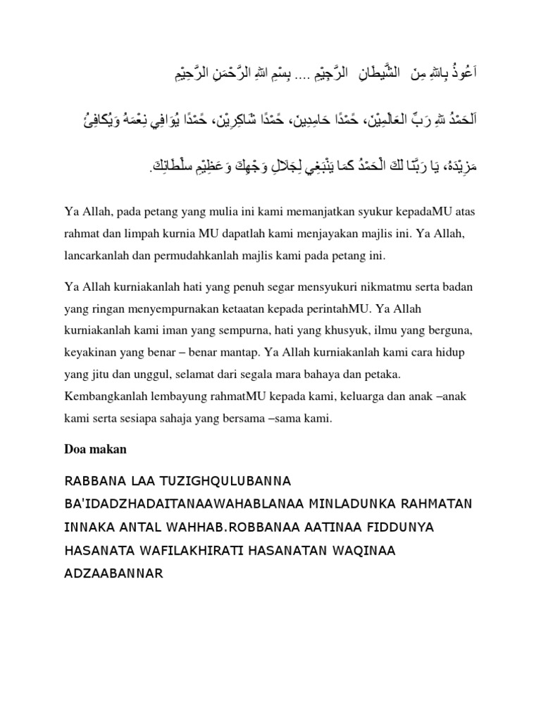 Jika ia lupa untuk menyebutnya hendaknya ia mengucapkan Bismillaahi fii awwalihi wa aakhirihi dengan. Doa Majlis Makan Malam. 2 Doa Kristen Untuk Pembukaan Rapat Supaya Mendapat Penyertaan Tuhan.
